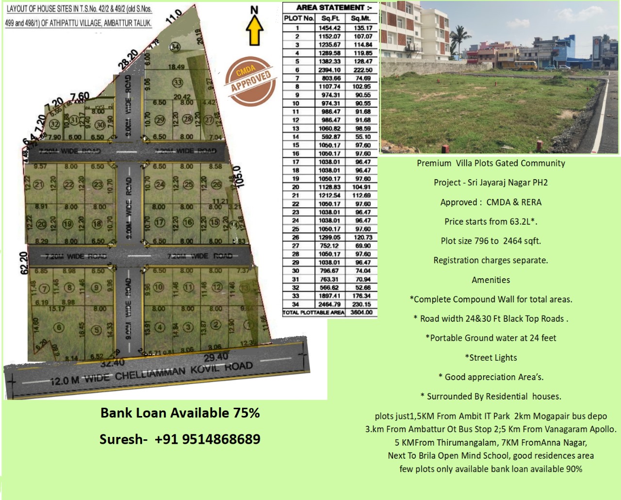 Pre launch Sri jayaraj Nagar PH -2 On Road cmda & rera approved villa CMDA Approved Gated Community Villa Plots Street Light Block top Roads Fully compound Good Ground water Near by houses and shops Project – Sri Jayaraj Nagar PH2 Approved : CMDA & RERA Price starts from 63.2L*. Plot size 796 to 2464 sq feet. Registration charges separate.