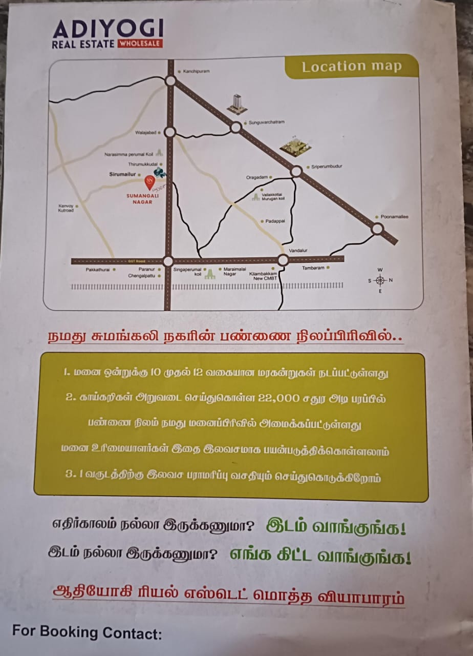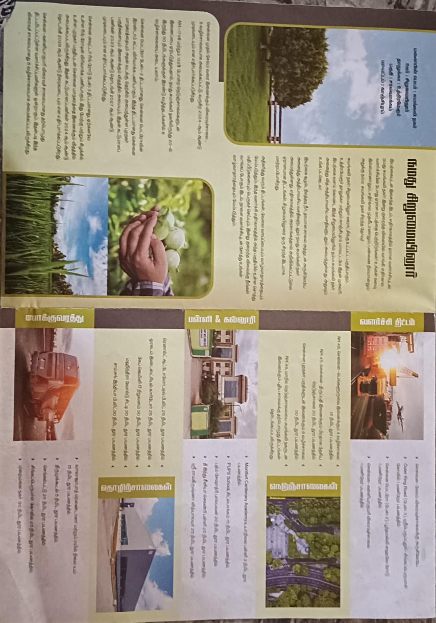 The Sumangali Nagar located at Sirumailur Village near Uthiramerur Taluk, Kanchipuram District is being developed to become near to Chennai City. It is one of the best residential plots in Uthiramerur Taluk with a total of 259 plots ranging from 1464 sq.ft to 3412 sq.ft.